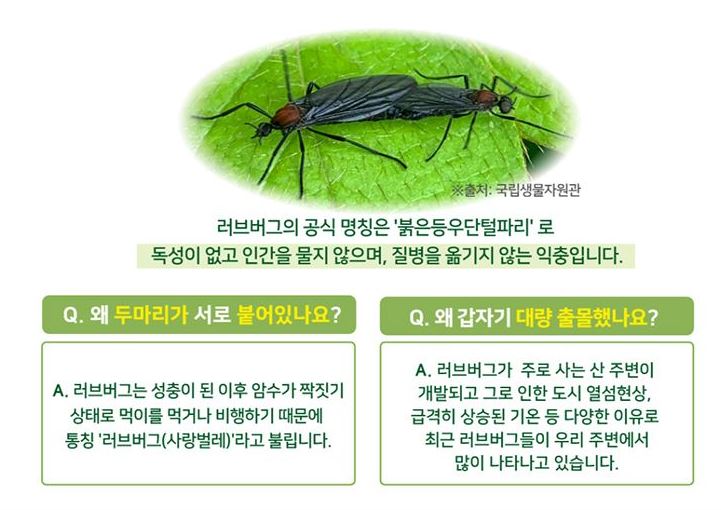 러브버그는 서울경기지역에 특히 많이 출몰하며, 수도권이 다른 지역과 다르게 도시열섬현상으로 급격한 상승된 기온 등 다양한 이유로 최근 러브버그들이 우리 주변에서 많이 나타나고 있습니다.
