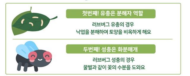 - 러브버그 유충의 경우 낙엽을 분해하여 토양을 비옥하게 합니다.