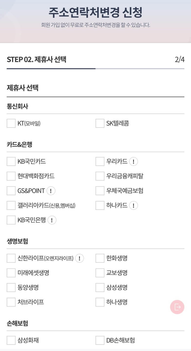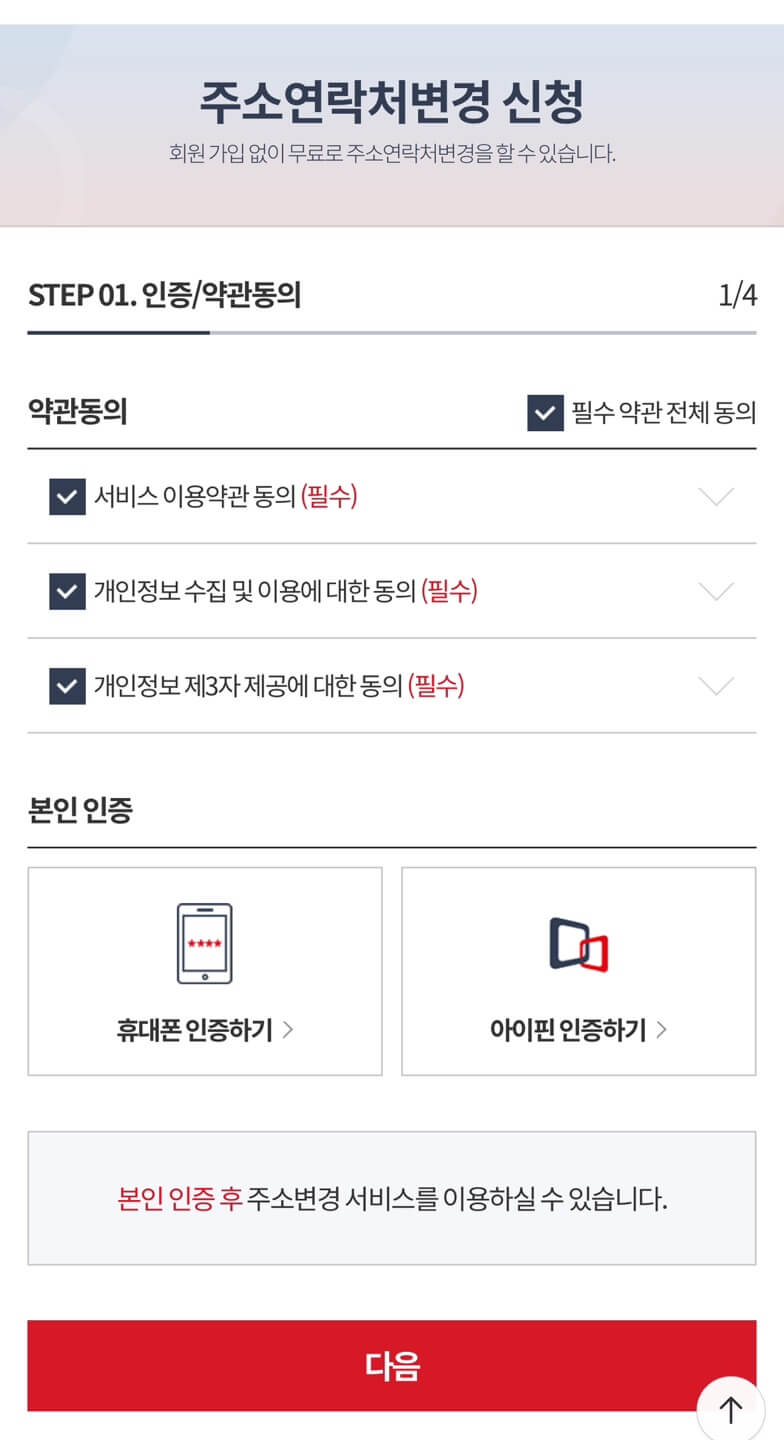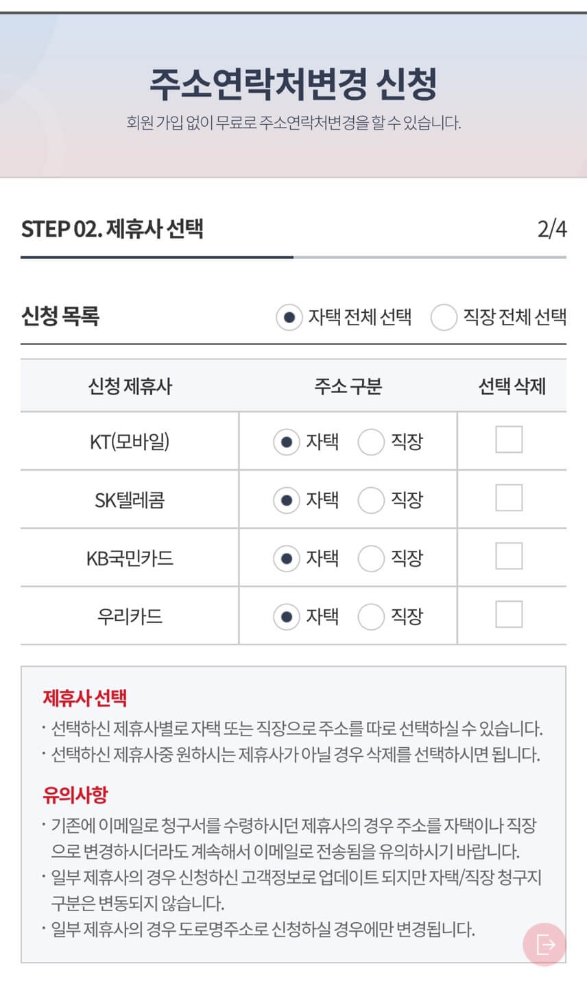 주소연락처변경신청 - 약관동의(본인인증) - 제휴사선택 - 신청목록(자택, 직장선택) - 신청자 정보입력 -