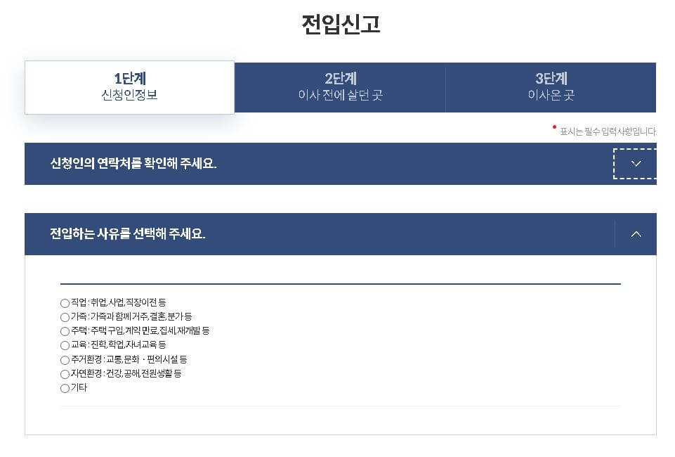 다음으로 신청정보 입력 후 전입하는 사유를 입력하셔야 됩니다.