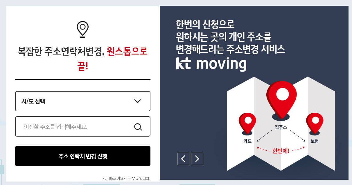 이사 후 주소나 전화번호를 일괄변경가능 서비스이며, 이름이 KT이라 다른 통신사는 안된다고 생각하시지만 통신사 상관없이 제휴사를 통해 신청가능하니 걱정 안 하셔도 됩니다.
