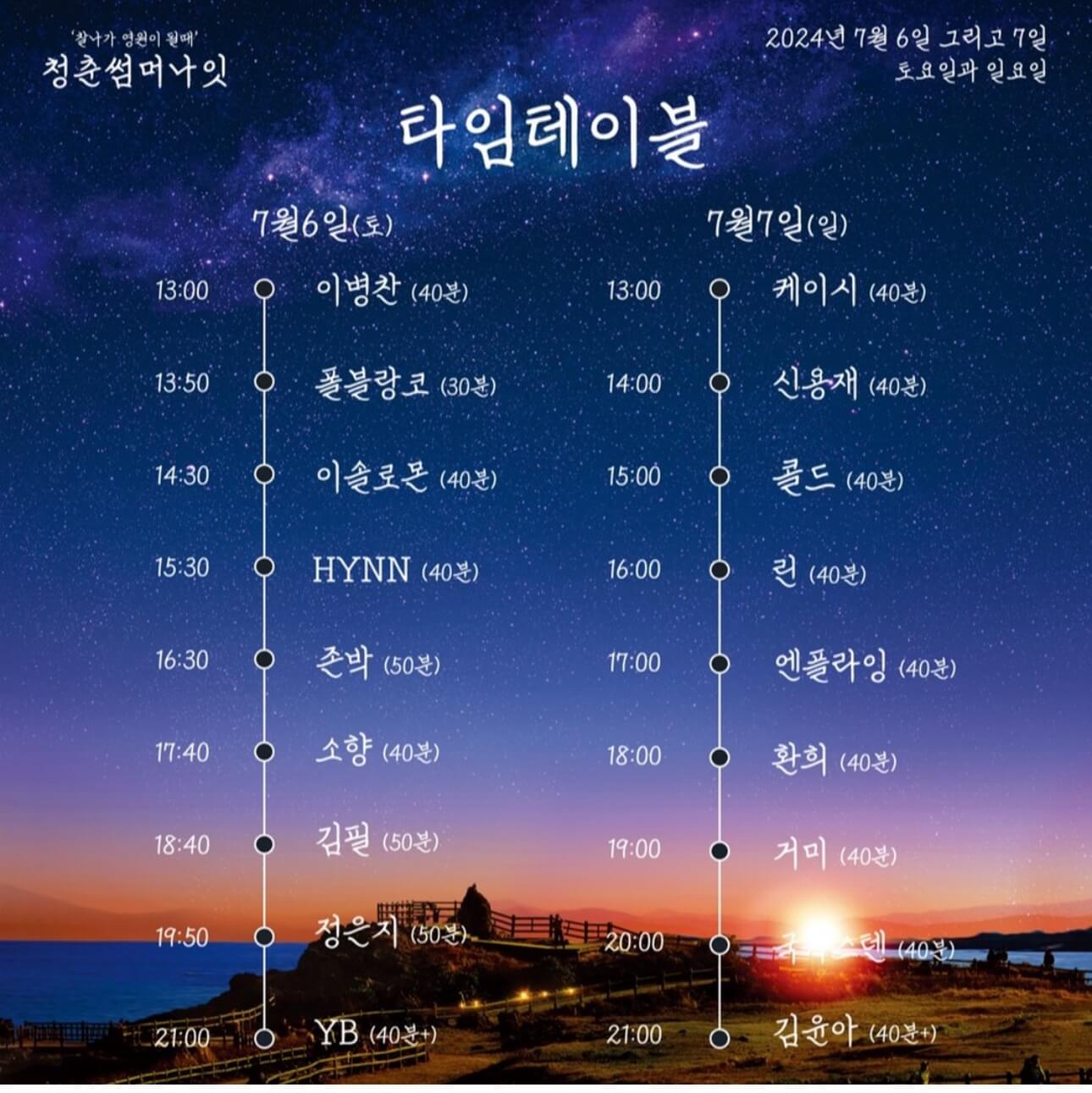 얼마남지 않은 청춘썸머나잇 2024 가수별 타임 테이블입니다.