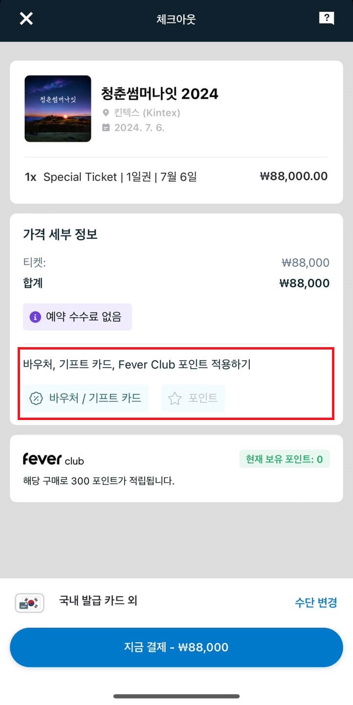 * 모바일 스토어(구글플레이어,애플스토어) - fever 검색 - 청춘써머나잇 - 프로필 - 바우처 - 코드입력 - 예매 - 바우처 쿠폰등록 - 할인가 결제
