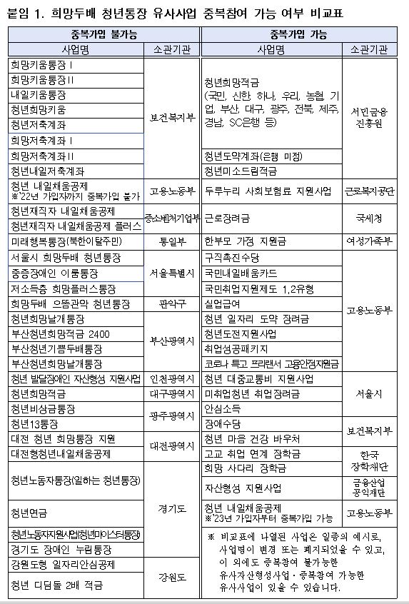 희망 두배 청년통장 유사사업 중복 가입여부 비교하기