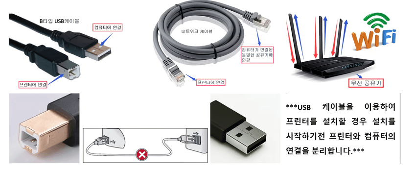 ➡️ 프린터 연결 : USB 케이블을 사용하여 프린터와 컴퓨터를 연결하거나, 무선 연결을 선택할 수 있습니다. 무선 연결의 경우, 프린터의 Wi-Fi 설정을 먼저 완료해야 합니다.